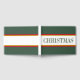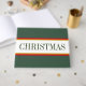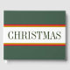 Festive bright Red and golden brun streck högdagrar texten "CHRISTMAS" inuti ett snövitt centrum rand. Den breda grönten rand ovan och under. Fyll i helgdag.