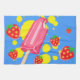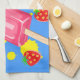 Kökshandduk med ett tema för summering. Designad med rosa popsicle och vissa röda jordgubbar som tumlar runt popsikeln tillsammans med lite gult stänk. Blå bakgrund.