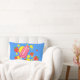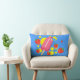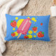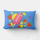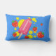 En lumbalkudde med ett summeröst tema. Designad med en rosa popsikel och vissa röda jordgubbar och gult stänk. Blå bakgrund.