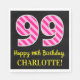 Den här roligtens pappra napkin-designen har ett stort nummer "99" med mörkens rosa och ljusa rosa rand mönster, tillsammans med meddelandet "Lycklig 99:e födelsedag" och personlig namn. Bakgrunden är svart på färgad. Roligt, redigerbara pappra blöjor som denna kan användas vid en födelsedagsfest som hålls för att fira någons 99-årsdag. [~Z0000380]