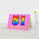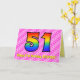 Den här populära 51:a födelsedagskalenderkortsdesignen har en framsida med ett stort nummer "51" med ett färgstarkt regnbågsspektrum som inspirerar till gradient mönster, på en glad ljus rosa och mörk rosa hjärtformer som rinner ut i mönster. På framsidan finns också budskapet "Lycklig 51:a födelsedag", följt av en personlig som tar emot namn. Insidan innehåller ett hälsning-meddelande från personligens födelsedag, eller kan kanske tas bort och lämnas tomt om ett meddelande ska skrivas för hand i stället. Ett sådant här födelsedagskort i anpassningsbar kan vara en roligt och ett lycklig sätt att skicka önskemål till någon som firar sin femtioförsta födelsedag. [~Z0000418]