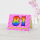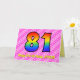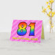 Den här roligten och den uppseendeväckande 81:a födelsedagskalenderns hälsningskort har en framsida med ett stort nummer "81" med en färgstark mönster som inspirerats av ett regnbågsspektrum, på en roligt med ljus rosa och mörk rosa hjärtformer i rand mönster. På framsidan finns också budskapet "Lycklig 81:a födelsedag", följt av ett anpassade som tar emot namn. Insidan innehåller ett hälsning-meddelande från personligens födelsedag, eller kan kanske tas bort och lämnas tomt om ett meddelande ska skrivas för hand i stället. Ett sådant här födelsedagskort i anpassadet kan vara en roligt och ett lycklig sätt att skicka önskemål till någon som firar sin åttio första födelsedag. [~Z0000418]