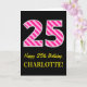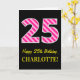 Framsidan av den här roligten och den enkla födelsematematiska hälsningskortet har ett stort nummer "25", med mörkens rosa och ljusa rosa rand mönster. Det innehåller också budskapet "Lycklig 25:e födelsedag" och en personlig namn. Bakgrunden till framsidan är svart färgad. Insidan innehåller ett redigerbart hälsning-födelsedagsmeddelande, eller så kan det kanske rensas och lämnas tomt om ett meddelande ska skrivas för hand i stället. Ett födelsedagskort som detta kan vara ett roligt för att skicka önskemål till någon som firar sin tjugofemte födelsedag. [~Z0000377]