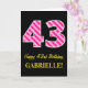 Framsidan av den här roligten och den enkla födelsematematiska hälsningskortet har ett stort nummer "43", med en ljus rosa och mörk rosa rand mönster. Det innehåller också budskapet "Lycklig 43:e födelsedagen" och ett redigerbart namn. Bakgrunden till framsidan är svart färgad. Insidan innehåller ett hälsning-meddelande från personligens födelsedag, eller kan kanske tas bort och lämnas tomt om ett meddelande ska skrivas för hand i stället. Ett sådant här födelsedagskort i anpassadet kan vara ett roligt för att skicka önskemål till någon som firar sin fyrtiotredje födelsedag. [~Z0000377]