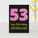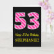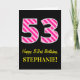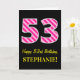 Framsidan av den här roligten och den enkla födelsematematiska hälsningskortet har ett stort nummer "53", med mörkens rosa och ljusa rosa rand mönster. Det innehåller också budskapet "Lycklig 53:e födelsedag" och ett anpassade namn. Bakgrunden till framsidan är svart färgad. Insidan innehåller ett anpassat hälsning-födelsedagsmeddelande eller kan kanske tas bort och lämnas tomt om ett meddelande ska skrivas för hand i stället. Ett sådant här födelsedagskort i personlig kan vara ett roligt för att skicka ett meddelande i firande om någons femtiotredje födelsedag. [~Z0000377]