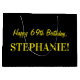 På ena sidan av den här roligten och den enkla presentsäcksdesignen med födelsedagstext finns ett stort nummer "69" med mörkens rosa och ljusa rosa rand mönster. Den andra sidan har födelsedagstexten hälsning, "69:e födelsedagen Lycklig", och ett redigerbart namn, båda i färgad av gult. Bakgrunden är svart på färgad. En presentpåse som denna kan användas när man slår in gåvor eller presenter ges till någon som firar sin sextionionde födelsedag. [~Z0000378]