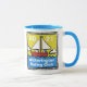Roligt Sailing Klubb Souvenir Mugg. Ljusstark och fetstilt grafik för segling av medlemmar i klubben. Anpassa med din egen klubb namn. Bild och text upprepas på båda sidor om mugg.