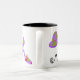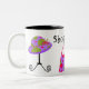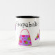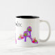 Whimsical mugg, med roligt grafik av rosa, lavender och grönt, väska och högklackar. Svart text överst läser Shopahok. Underbara kopp för varje daglig använda i hemmet eller på kontoret.