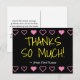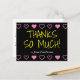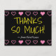 Den här roligtens tack-du-vykortsdesign innehåller meddelandet "THANKS SO MUCH!" på framsidan, tillsammans med ett anpassade på baksidan. Den har även dekorativa hjärtformer. Det skulle kunna användas för att visa uppskattning för någon som har gjort något speciellt.