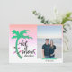 Skicka varma önskningar denna högtidssäsong med dessa roliga tropiska julkort. Kortens text lyder “låt det snöa… någon annanstans” med en ljus palmkrona och illustration av sladdbelysning. Lägg till ditt eget foto och namn.