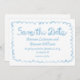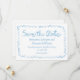 Fånga din speciella dag från första början med vår vita ljusblåa spara datumkortet för vågrät! Infekt med den trevliga dåsiga blå ram och personlig med namn och bröllop är detta kort en charmerande förhandsvisning av glädjen för kom. Med sin lekfulla utformning och nya toner sätter vårt sparande datumkort perfekten för det kommande firande. Vare sig du planerar en våghund, en sommarströ till havs eller en vintersaga, så går med det här kortet inbjudan dina gäster på den vismliga resan mot dig lyckligt efter. Designat för att på ett smidigt sätt komplettera vår fantastiska bröllopsinbjudan, gör vår besparing av datumkortet att vi får en sammanhängande och fängslande presentation som lämnar ett bestående intryck. Ta till dig magin i kärlek och skratt när du inbjudningarna din närmaste och längsta tid för att markera sina kalendrar för din speciella dag. Med enkel anpassning av onlinen kan du skräddarsy alla detaljer så att de återspeglar din unika stil och personlighet. Låt oss spara datumkortet som det första kapitlet i er kärlek-historia, fyllt med värme, och ett löfte om lyckligt allt efter.