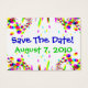 Med "Spara datum!" och datumet i mitten blir det en roligt och ett unikt kort. Anpassa det här färgstarka och festliga inbjudningskortet med datumet för party och placera din anpassningsbar på baksidan, eller ta bara bort texten om du inte vill ha den. Underbart även för namn bricka, märken, presentkort, bokmärken, märkre, etiketter, bord-platskort, födelsedagsfester, fackföreningar, företag party, tackkort, och när som helst behöver du ett färgstarkt, sunt anpassningsbar. Visar knubbigets storleka kort. Två andra storlekar finns tillgängliga. Hämta lite och få redo för roligten!