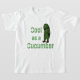 Lönsam grönt gurka som står med sin arm hopfälld och en kinkig flin på hans ansikte. Han bär en svart väst, bruna stövlar och svarta nyanser. Till sidan och nedanför är ord "Coola som gurka" i grönt.