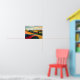 This artwork is a stunning fusion of mid-century modern aesthetics and contemporary abstract landscape painting. It features a series of rolling, rhythmic hills rendered in a bold, saturated palette of crimson, mustard gold, deep teal, and earthy ochre.