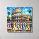 A sunlit Roman morning unfolds before the Colosseum, where elegant strollers in vivid mid-century fashion bring timeless Italy to life. Rich brushwork, warm stone tones, palm silhouettes, and a festive crowd create a glamorous travel scene filled with history, romance, and old-world charm. Perfect for living rooms, hotel interiors, or anyone who loves Rome, vintage style, European architecture, and unforgettable city wall art.