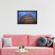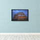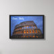 Ett slående foto av den latinska kolosseum som är ett gammalt landmärke i Rom, Italien. Ett intressant vinkelt och perspektiv. Shot på natten med bågarna tända och glödande orange. Himlar har mörk blått stormiga moln ovanför.