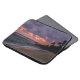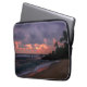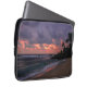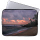 Det avslimmade solljuset skapar vackra rosa- och orangar i himlar, skapar silhuetter från träd i handflatan och belyser den milda surfan. Tranquil strand scen.