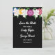 Denna inbjudan till bröllop spara datum i elegant är perfekt för en modern sommartid i blommigt bröllop. Den romantiska designen har blått, gult, lila och burgudisk ro med elegant vit typografi på en fet svart bakgrund.