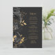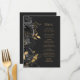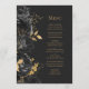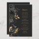 Den här elegantens moderna bröllop-meny har en gräns av svarta blommor och guld faux foil löv. Anpassa guld-färgad kursiv text på mörkens svarta bakgrund. Baksidan av menyn är massiv skiffersvart.