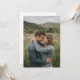 This invitation features a romantic and serene design, capturing a couple embracing in an outdoor setting surrounded by tall grass and distant hills. The color palette is dominated by medium blue denim tones, complemented by soft earthy hues from the natural landscape. The photograph emphasizes realistic representation with gentle lighting that enhances the intimate mood of the scene. Perfect for weddings or engagements, this design focuses on natural beauty and emotional connection, making it ideal for those seeking a heartfelt and tranquil aesthetic.