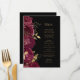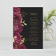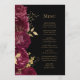 Den här elegantens moderna bröllop-meny har en gräns av burga blommor och guld faux foil löv. Anpassa guld-färgad kursiv text mot svart bakgrund. Baksidan av menyn är helsvart.