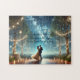 This enchanting artwork "Dancing Under the Stars: Romance of Eternal Love and Dreamy Nighttime Magic" jigsaw puzzle captures the timeless beauty of love beneath a starry sky. A couple sways gracefully on a glowing wooden dance floor surrounded by soft, twinkling fairy lights in a serene forest clearing. The woman, in a flowing gown, and the man, in a classic suit, embody the purity of romance. The vivid constellations above symbolize dreams and endless possibilities, while the intimate setting reflects the warmth and magic of shared moments. The included quote, "Beneath the stars, where dreams take flight, our love dances through the night," adds an emotional connection, making this puzzle a perfect keepsake for weddings, anniversaries, or romantic occasions.
