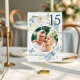 Romantiska Dusty Blue Watercolor Blommigt Bröllop Photo Bordsnummers har dammiga blå celeste och delfinblommor med eukalyptus greenery accated with butterflies. Lägg till anpassningsbarna i elegantens moderna kalligrafiskript. Lägg till ditt favoritfoto och hashtaggen i personligt bröllp. Lägg till varje enskilt bordsnummer. Designad för dig av Evco Studio www.zazzle.com/store/evcostudio