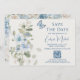 Romantic Dusty Blue Blommigt QR Code Bröllop spara datum Card har dammiga blå celeste och delfinblommor med eukalyptus greenery accated with butterflies. Lägg till anpassningsbarna i elegantens moderna calligraphy-skript, med bröllop webbplats och QR-kod. Designad för dig av Evco Studio www.zazzle.com/store/evcostudio