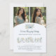 This graduation announcement features a delicate watercolor effect design, highlighting a personalized two-photo collage with elegance and charm. The dusty blue graduation cap is beautifully combined with eucalyptus branches and wildflowers, adding a romantic and serene botanical touch. The graduate’s name stands out in flowing calligraphy, while the school name and graduation year are presented in a simple, refined font.