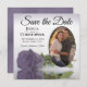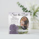 De här vackra datumkorten är det perfekt sättet att låta dina vänner och familj få veta om ditt kommande bröllop. De har en elegant som är utformad med en enda dammig lila eller lavender färgad ro som reflekterar i ett bassäng i vatten med vinkara och krämer med ditt foto i en ovalformad ram. Rubriken läser Spara datum med utrymme för namnen, datum och plats. Baksidan är en marmorerad lila grått färg.