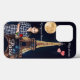 Romantic Girl Eiffel Torn Dream iPhone 13 Pro-Caseser är det vackraste torn i Paris och den vackra flicka som håller ett vackert ro i handen visar en stark romantisk dröm med romantiskt ord och torn är mycket vacker med ljus. Svart bakgrund och hjärta ser ut.