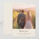 This wedding thank you card features a romantic and elegant design with a couple walking hand-in-hand through a vineyard, bathed in the warm glow of a setting sun. The color palette is dominated by soft golden hues and deep greens, creating an intimate and serene atmosphere. The layout captures the couple from behind as they gaze into the distance, emphasizing simplicity and elegance. The typography includes stylish script for "Thank you" and well-spaced serif letters for names, enhancing the polished look. Perfect for expressing gratitude after a memorable celebration, this card conveys a mood of love and tranquility.