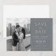 This wedding save the date features a split design with a black-and-white photograph of a couple embracing on a balcony overlooking a cityscape, paired with a modern gray panel for text. The layout is clean and balanced, using sans-serif typography to convey important details in an elegant manner. The monochromatic color palette enhances the contemporary aesthetic, creating a harmonious blend of personal sentiment and formal announcement. Perfect for couples seeking a stylish and sophisticated way to share their upcoming nuptials.