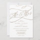Den romantiske kalligrafin guld, mr och mrs bröllopsinbjudan är perfekt för ett enkelt bröllop. Den moderna klassiska designen har finare-snurrar och vitaktiga blomningar med elegant elegant-handskriven faux champagne guld-folie-typografi. Obs! Den här designen har inte äkta guld-folie. Det är en grafik av hög kvalitet som framställs som guld-folie.