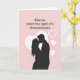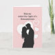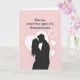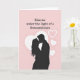 This greeting card shows a black silhouette of a couple kissing, with their arms wrapped around each other in a close hug. Behind them sits a large white heart, centered like a soft spotlight that frames their faces. The background is a light blush pink, and small white hearts—some filled in and some just outlines—float around the couple. At the top of the card, the text reads “Kiss me under the light of a thousand stars.” The words are set in a neat serif style, in a dark color, and they sit above the main image so they’re easy to spot first. The simple contrast of black figures against the pink and white shapes keeps the focus on romance and closeness ❤️