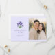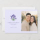 This wedding save the date features a split layout with an elegant lavender illustration on the left and a warm, candid photo of a couple on the right. The design combines soft purples and greens from the floral illustration with golden hues from the photograph, creating a romantic and serene mood. Classic serif fonts add a touch of formality to the customizable text, which includes names, dates, and location placeholders. Perfect for couples looking to blend personal warmth with timeless elegance, this design captures the joy and anticipation of their upcoming wedding in Naples, Florida.