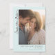 This wedding save the date card features a romantic and intimate design with a soft pastel color palette of light blue and warm beige tones. The layout is elegantly asymmetrical, blending a serene outdoor photograph on one side with clean graphic elements on the other. The cursive script "Save the Date" adds an elegant touch, while the serif font provides a formal contrast for the names and details. Perfect for setting the tone for a joyful celebration, this card captures the essence of anticipation and love.