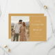 This wedding save the date features a split layout with a romantic outdoor photograph on one side and elegant text on a mustard yellow background. The color palette includes earth tones like beige, light brown, and muted green, complemented by the warm mustard hue. The typography combines modern serif and script fonts to create a sophisticated yet intimate feel, perfect for setting the tone for a memorable event. The design captures a serene and dreamy mood, ideal for couples looking to share their special moment in a stylish and heartfelt way.