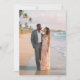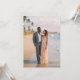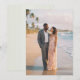 This wedding invitation features a serene beach scene with two individuals standing close together on the sandy shore, capturing a romantic and tranquil atmosphere. The composition is oriented horizontally, showcasing expansive views of the ocean and sky in soft pastel hues of pink and blue, suggesting either sunrise or sunset. Palm trees add a tropical touch to the background, enhancing the natural beauty of the setting. The design employs a realistic art technique, emphasizing authenticity and creating an inviting mood perfect for celebrating love by the sea.
