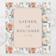 These wedding wine labels feature a romantic and vintage-inspired design with a symmetrical floral pattern in warm pastel shades of peach, cream, and soft blue-green. The central rectangle is filled with a solid pale pink color, providing an elegant backdrop for the classic serif typography that allows customization for names and dates. Surrounding this focal point, detailed roses and smaller flowers create a harmonious and timeless look, perfect for celebrating your special day. The overall mood is one of warmth and celebration, making these labels ideal for commemorating your wedding with a touch of delicate beauty.