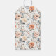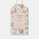 This wedding favor tag features a romantic floral design with large peach peonies and blue-green leaves, creating an elegant garden-like appearance. The central beige rectangle is framed by a dark gray border, containing classic serif typography that conveys gratitude for sharing the special day. Customizable placeholders allow personalization with names and dates, making it perfect for expressing heartfelt thanks at weddings. The overall style is vintage-inspired, evoking warmth and celebration in its soft color palette and detailed illustrations.
