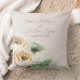 Den romantiska blommigten dekorativ kudde har en elegant elfenbensbakgrund i färg med vattenfärgade ranunculus-blommor. En delikat bukett av persikor och vit färgad ranunculus bildas på grund. Namnen på ett nytt provexemplar av paret och bröllop trycks ovan. Du kan anpassa kudden så att den innehåller egna namn eller egen text.