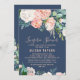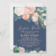 Det här romantiska blomsterkortet för blåkvarn är perfekt för en elegant möhippa. Blommigtens utformning har rosa, persikor och vita blomkorgsblommor i marin blå bakgrund.