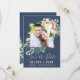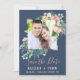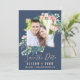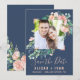 Den romantiska blomman blåfoto som sparar datumkortet är perfekt för ett elegant bröllop. Blommigten har rosa, persiko- och vitvattenblommor med faux-ro guld-geometriskt inslag på marin blå bakgrund. Anpassa kortet med förlovning bild, namn, bröllop, datum och plats. Obs! Den här utformningen har inte äkta folie av ro guld. Det är en grafik av hög kvalitet som framställs som en shimmer från ro guld.