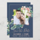 Den romantiska blomman blåfoto som sparar datumkortet är perfekt för ett elegant bröllop. Blommigten har rosa, persiko- och vitvattenblommor med faux-ro guld-geometriskt inslag på marin blå bakgrund. Anpassa kortet med förlovning bild, namn, bröllop, datum och plats. Obs! Den här utformningen har inte äkta folie av ro guld. Det är en grafik av hög kvalitet som framställs som en shimmer från ro guld.