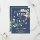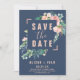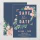 Den här romantiska blomman blått sparar datumkortet är perfekt för ett elegant bröllop. Blommigten har rosa, persiko- och vitvattenblommor med faux-ro guld-geometriskt inslag på marin blå bakgrund. Obs! Den här utformningen har inte äkta folie av ro guld. Det är en grafik av hög kvalitet som framställs som en shimmer från ro guld.
