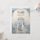 Set the tone for your formal engagement with a romantic, dusty blue and creamy off-white design featuring an elegant printed sculptural proposal scene.This formal stationery design employs a simulated bas-relief sculptural aesthetic, utilizing digital 3D shadow techniques to create the visual illusion of carved paper craft. The central composition features an elegant proposal scene with a kneeling groom and a bride in a flowing gown, set against a traditional chapel backdrop and framed by an intricate botanical border of leaves and floating petals. The atmospheric color palette pairs cool dusty blue and light grey tones against a warm, creamy off-white background, establishing visual hierarchy through sophisticated calligraphy script and traditional serif typography.This is a flat printed image with a faux embossed texture effect, not actual raised material.