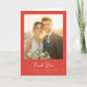 This wedding thank you card features a romantic and elegant design with a central photograph of a couple in formal attire, surrounded by a warm red border. The color palette includes soft golds, beiges, and pastel floral hues, creating a serene and joyful atmosphere. Below the photo, stylized cursive text reads "Thank You," followed by customizable names and location in clean serif fonts, adding a personal touch to this heartfelt keepsake. Perfect for expressing gratitude after a special celebration, this card captures the essence of love and appreciation.