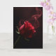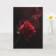 This card shows a single crimson rose rising from the lower-left corner, its petals still gently curled as if caught mid-bloom 🥰. Deep shadows surround it, making the red folds look richer and the softly lit edges glow like they’re blushing. A green stem and small sepals sit beneath the bloom, adding a calm, natural counterpoint to the heated red. On the right side, reddish smoke drifts upward in thin, see-through curls, echoing the rose’s curves like a quiet dance between two close partners ❤️. The background stays velvety and nearly black, so the rose and smoke feel like they’re sharing a private moment in the dark. Near the top center, a short line of text appears in a pale pink tone, spaced with plenty of breathing room. A second, smaller line sits below it in the same color, keeping the lettering light against the dark field. The smoke’s warm glow fades as it rises, and its wisps taper into delicate threads near the upper-right edge.