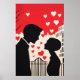 En visuellt slående teckning som skildrar en romantisk scen med ett silhuetterat par som blickar mot varandra. Bakgrunden visar en pulserande röd himmel fylld med flytande vita och röda hjärtan, vid sidan av obönhörligt svart och vitt byggnad och ett blott träd, vilket tyder på en stadsinställning. Konsten stil är djärv, modern och minimalistisk, och betonar kärlek och sambandet mellan de två figurer.